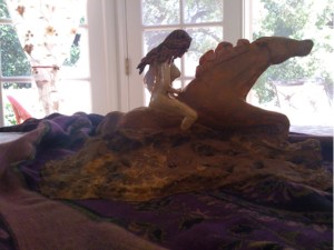 During a guided meditation in my women’s circle, I saw an image of my Higher Self. Emerging from the heart of the earth, I sat astride a powerful horse, my golden body in sweet repose, a heavy dampness on my back…furled wings! Feeling compelled to create Her into form, I took my joy to my Q&A journal where I converse with my Higher Self. I’m the Q, she’s the A…